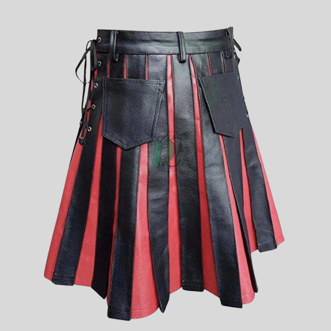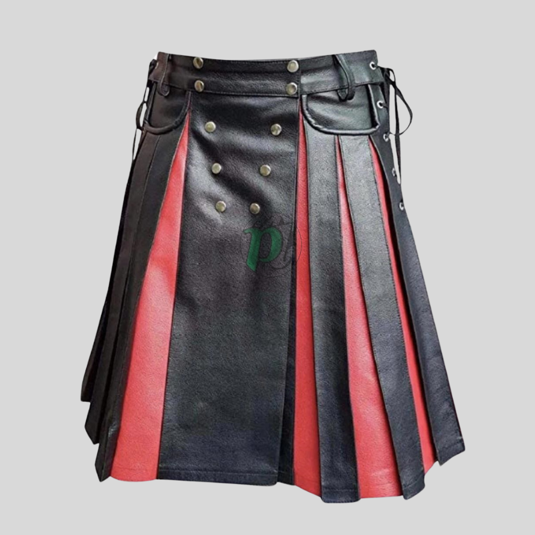 The Black Leather Kilt with Red Panel and Utility Pockets combines bold visual contrast with functional design and premium craftsmanship. Made from high-quality genuine leather, this kilt features a sleek black base accented by a striking red panel, delivering a powerful and modern statement look.