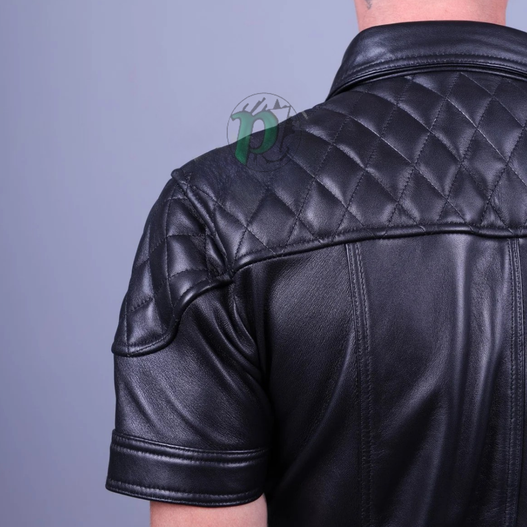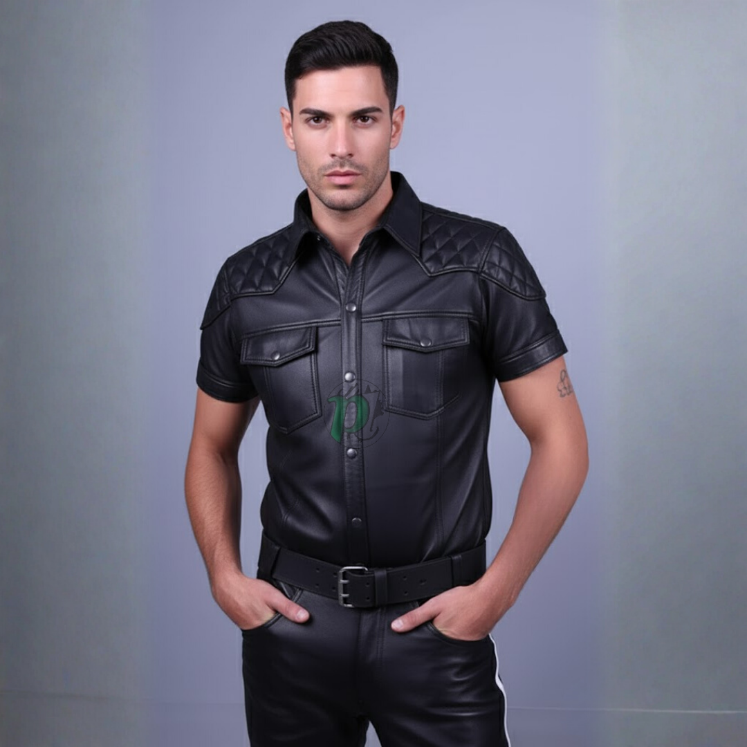 A bold upgrade to the classic leather shirt. This fitted short-sleeve design features padded shoulders with cross-hatched stitching, black snap buttons, and two chest pockets, giving it a strong and stylish look.