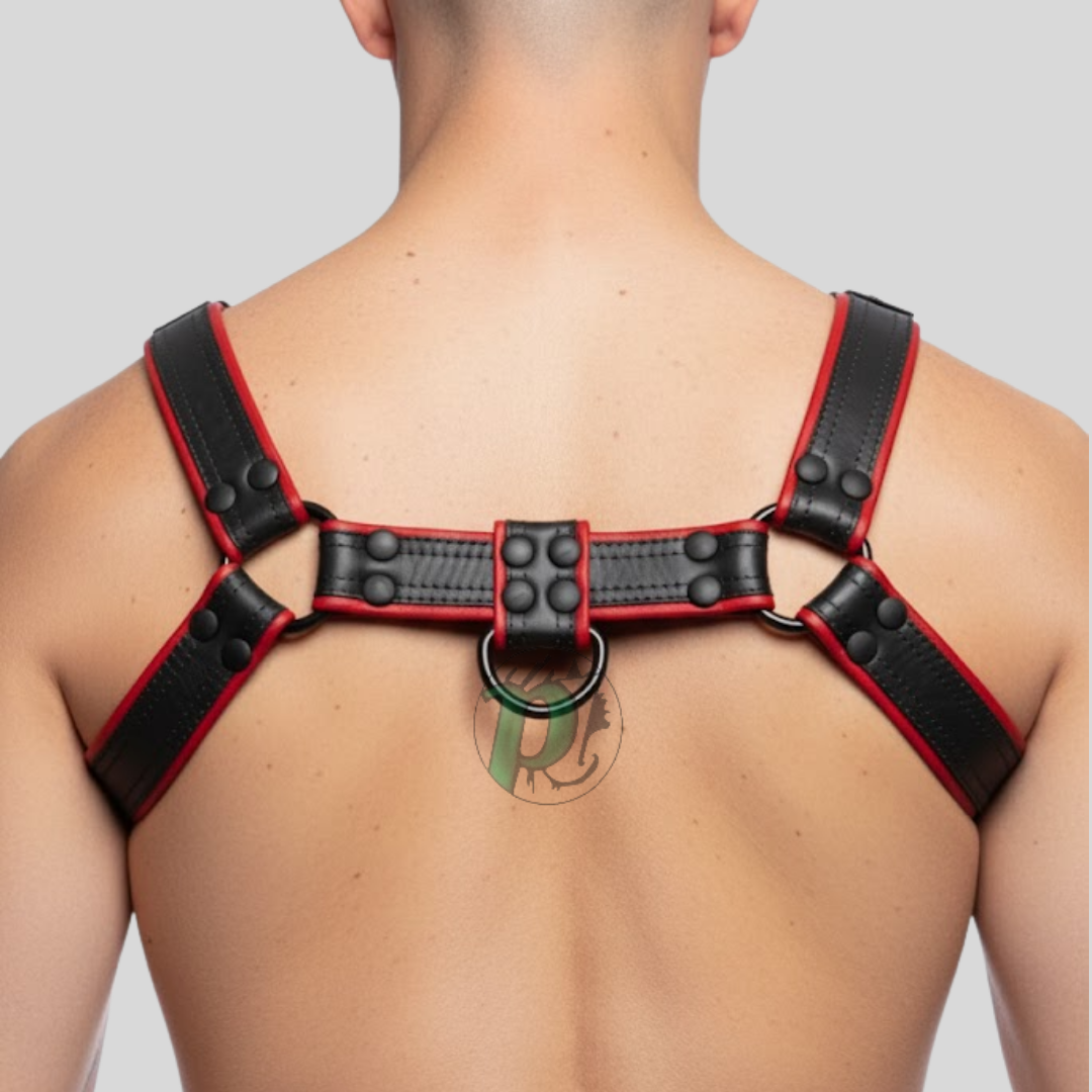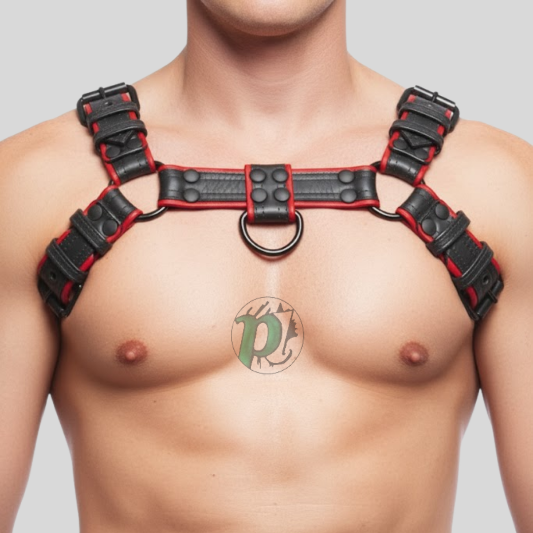 Designed for both comfort and durability, it includes adjustable shoulder and chest straps with heavy-duty metal buckles and O-rings, ensuring a perfect, secure fit. Ideal for confident styling, events, or everyday wear, this harness showcases craftsmanship and individuality in every detail.