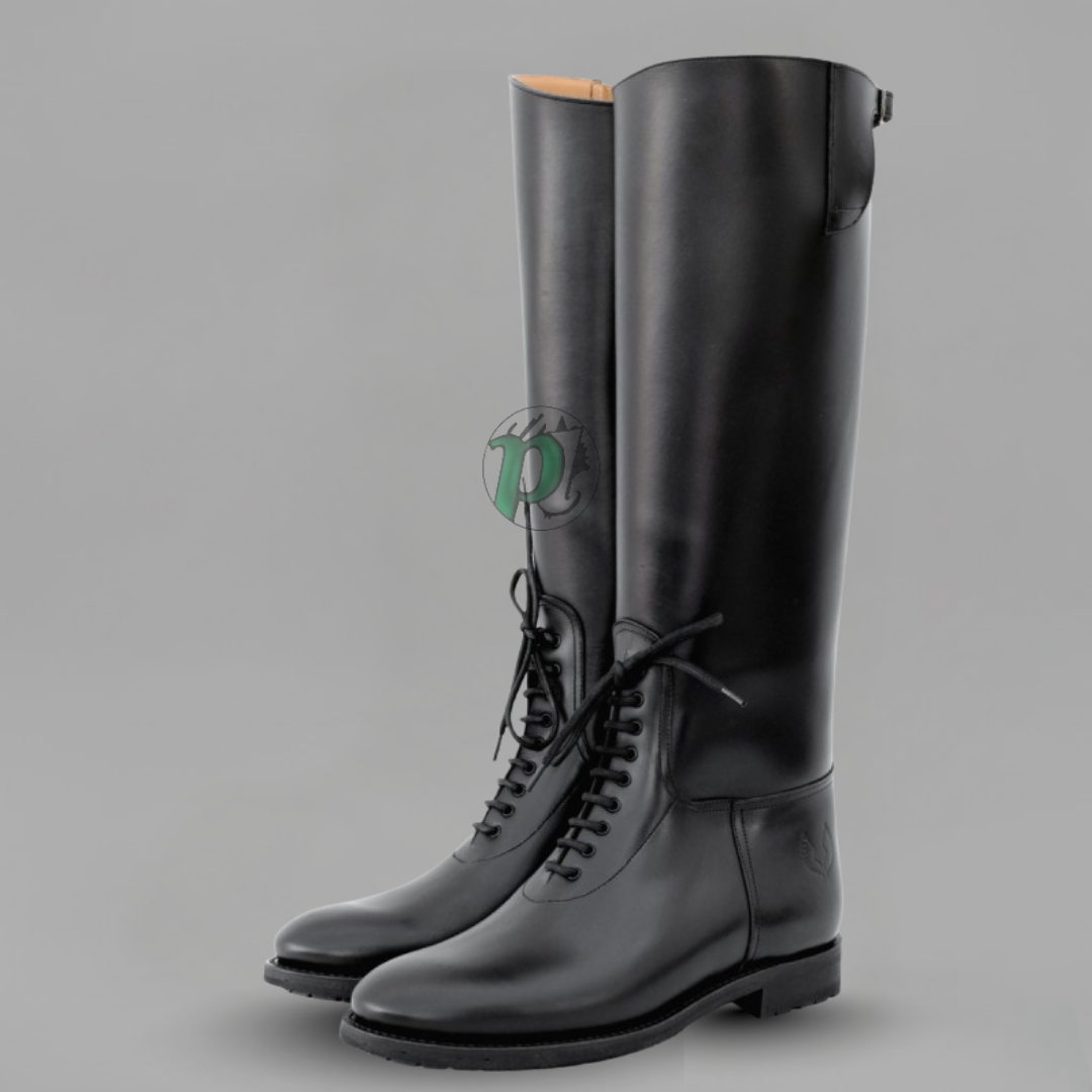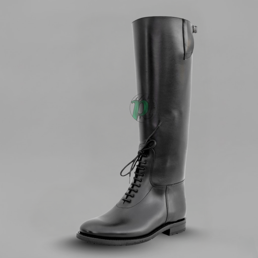 Featuring a tall shaft with front lacing, these boots ensure a snug, adjustable fit while maintaining a commanding look. The smooth leather finish, reinforced toe, and sturdy sole provide unmatched stability — whether you’re on the saddle, the street, or the stage.