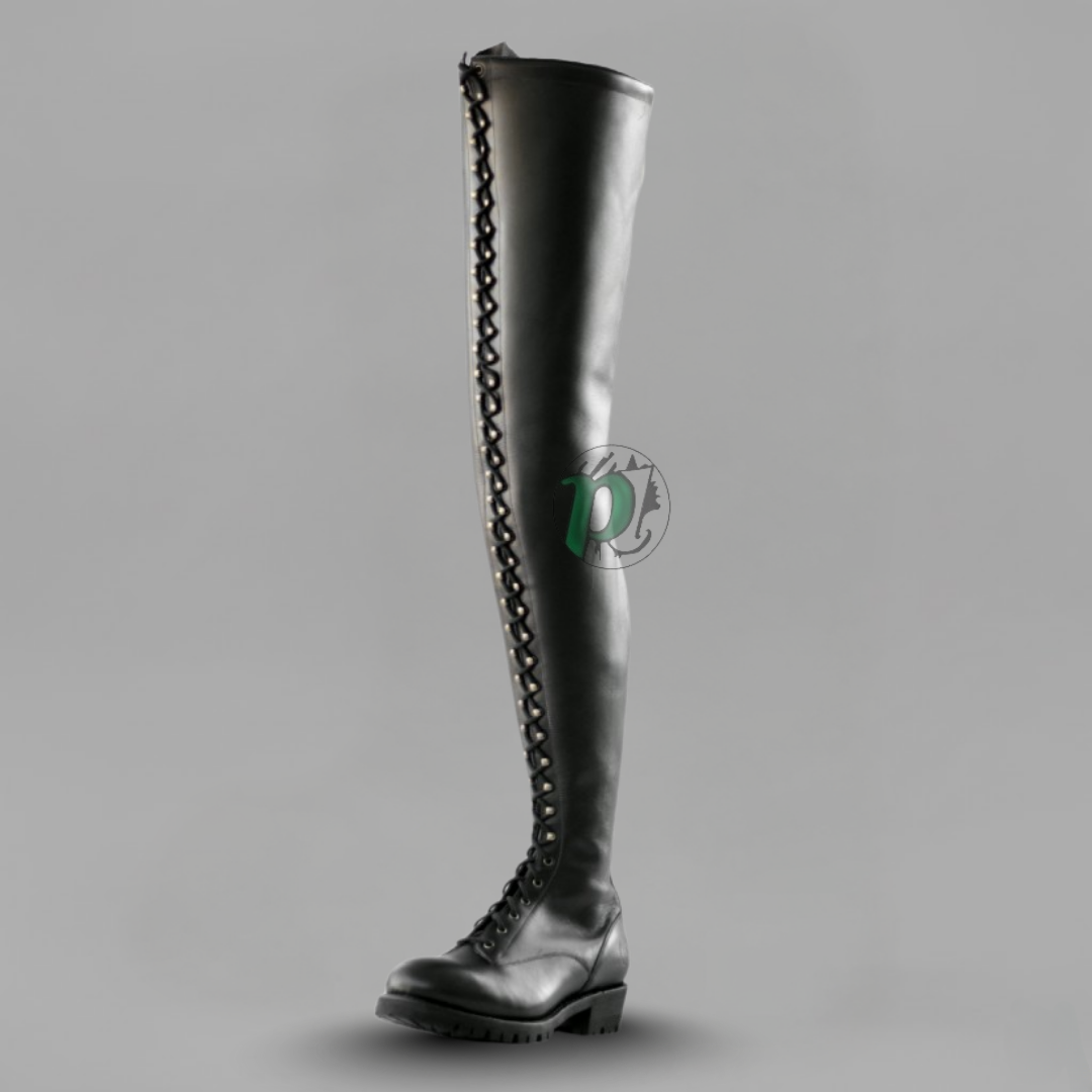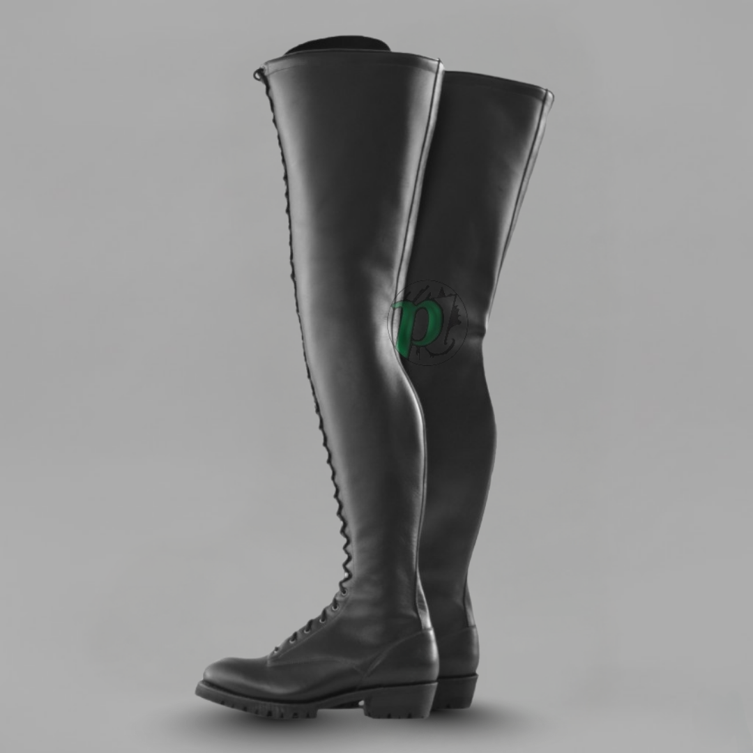 Designed with a full front lace-up closure, they allow a perfectly snug, adjustable fit from ankle to thigh. The smooth black leather finish, reinforced sole, and sturdy construction ensure long-lasting wear, comfort, and undeniable presence.