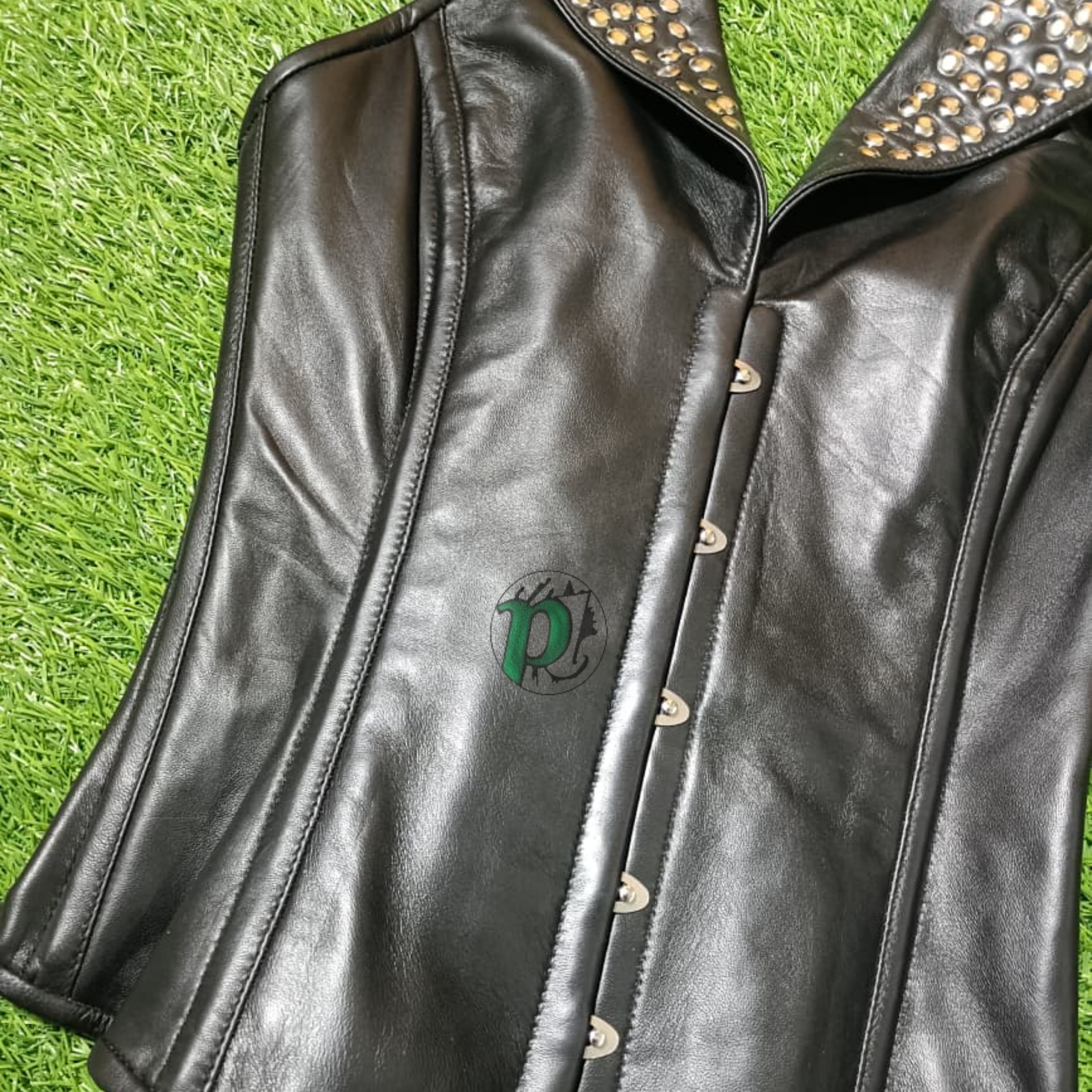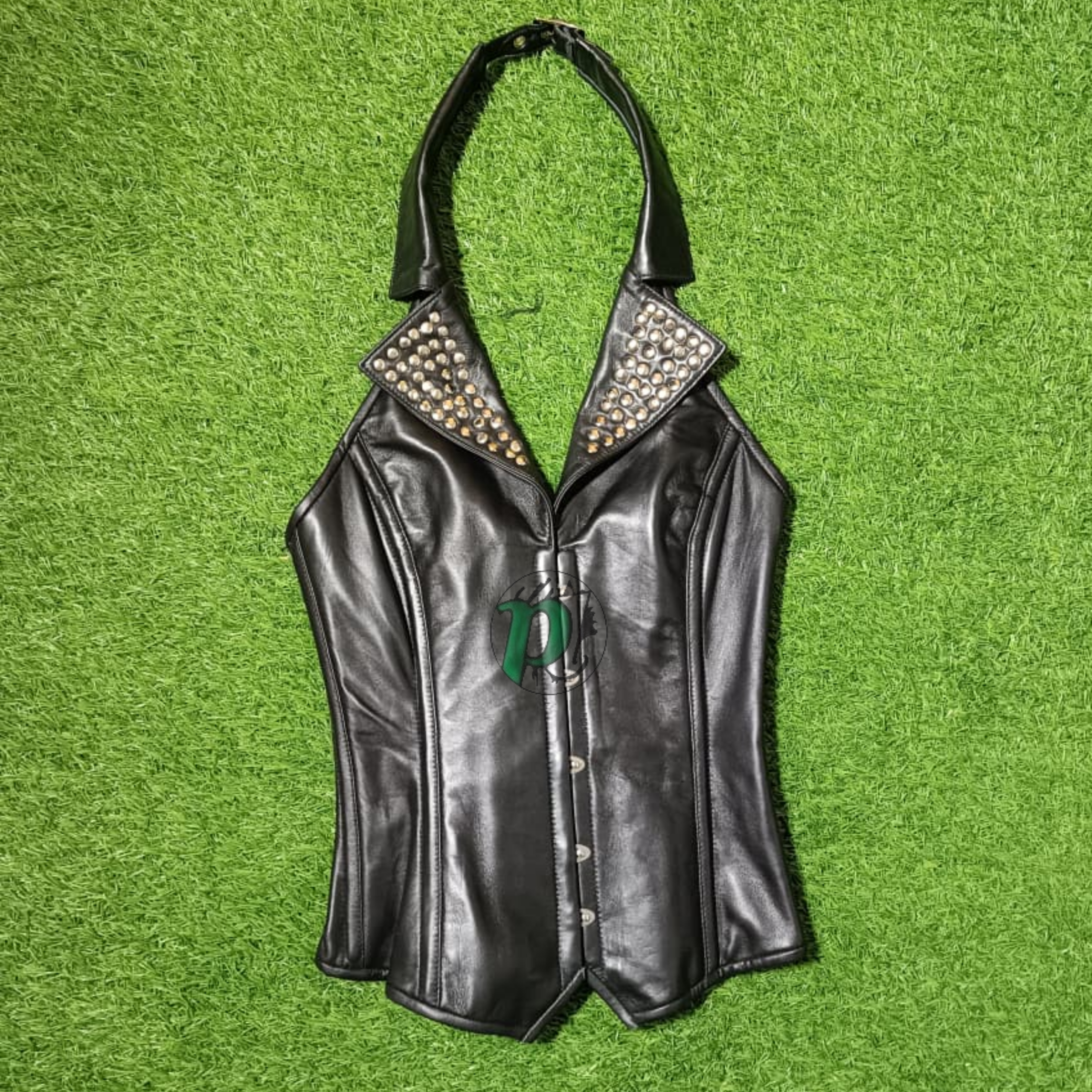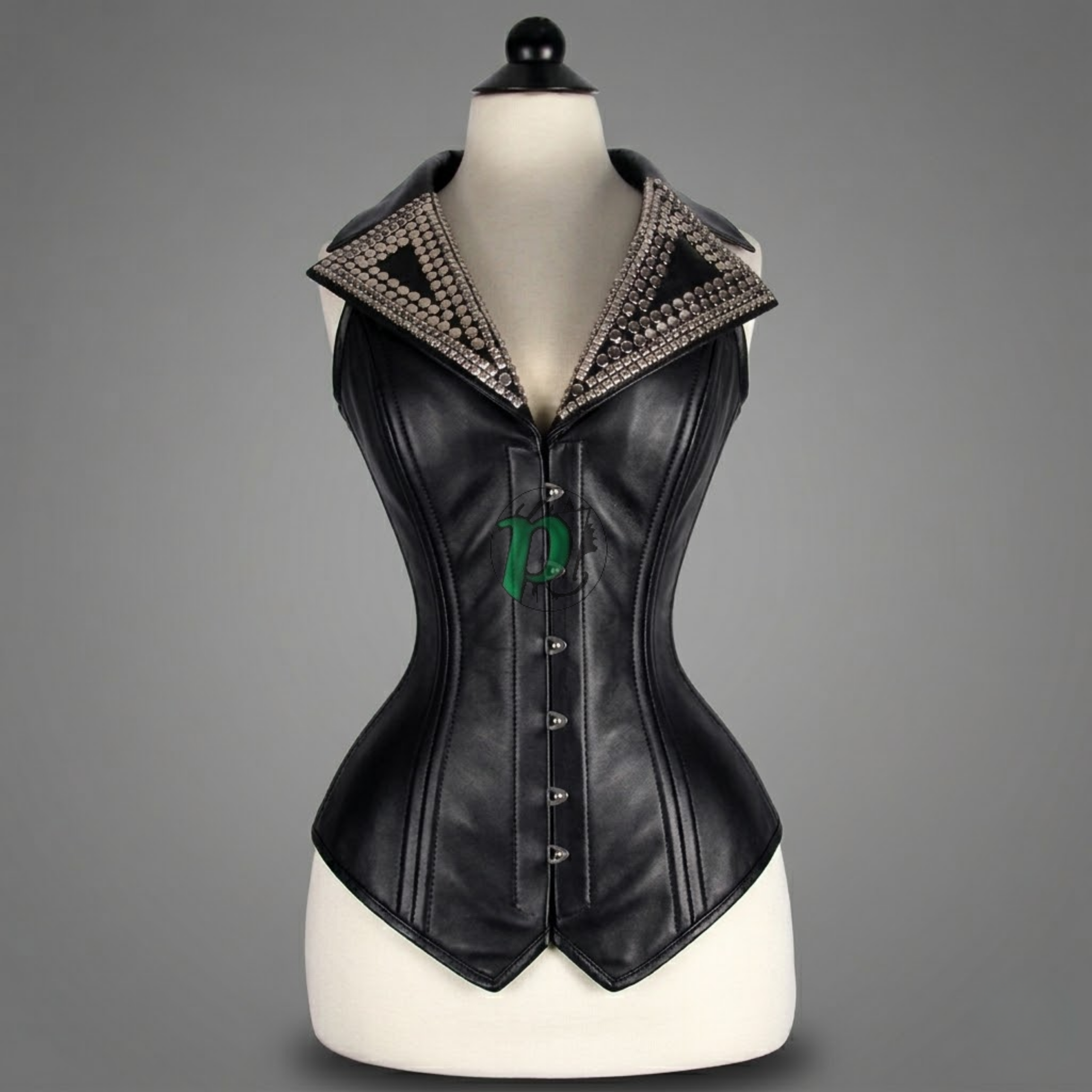 Elevate your wardrobe with this striking overbust corset, meticulously crafted from premium genuine leather for a sleek and sculpted finish. Designed to combine elegance with bold attitude, this piece features a dramatic wide collar adorned with metallic studs, creating a powerful gothic and high-fashion aesthetic.